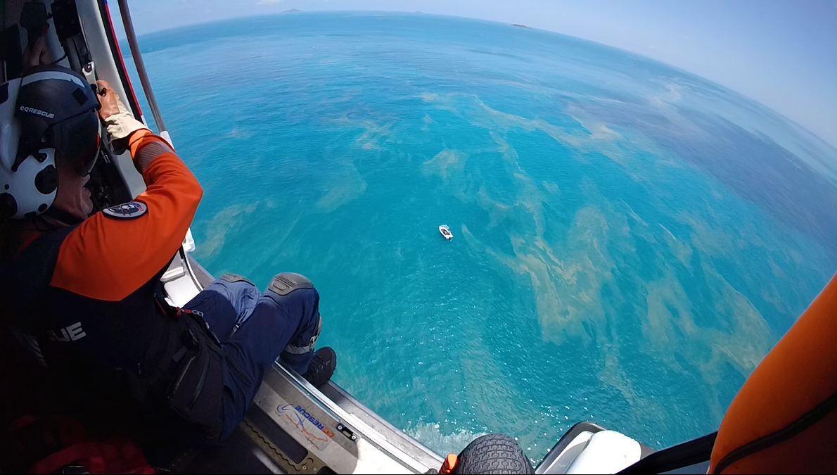 Both people on board were in good spirits and healthy, so a radio was winched to them from the helicopter so they could communicate with Marine Rescue Queensland Mackay, who were on the way to offer mechanical support or a tow if needed.